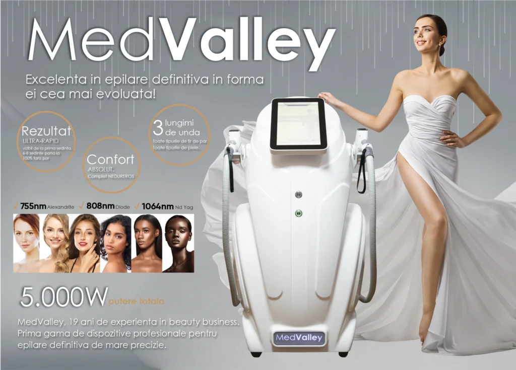 MedValley este aparatul de epilare cu trei lungimi de unda (Alexandrite 755 nm | Diode 808 nm | 1064 Nd Yag) ce functioneaza prin utilizarea fototermolizei selective. Fototermoliza selectiva presupune folosirea energiei laser pentru a incalzi foliculii pilosi (radacina firului de par) la temperaturi foarte mari, ducand la distrugerea acestora in mod controlat.